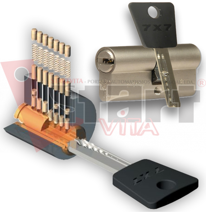 Os cilindros de segurança do sistema 7×7 Mul-T-Lock têm um mecanismo de tambor de pinos com 7 câmaras.