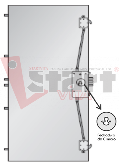 Pontos de Fecho: Equipada com fechadura de segurança ATRA, de função dupla (motorizada e mecânica), com trinco e três linguetas. Mais duas trancas tipo “gancho”, com acionamento pela fechadura, com fecho ao alto e baixo, a trancarem lateralmente no aro. ▪ No lado das dobradiças existem seis pernos de aço, fixos, com inserção no aro aquando do fecho da porta.