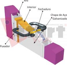 Possui duas dobradiças homologadas pela NORMA D.I.N., uma com acionamento por mola de recurso de fecho semiautomático. Seis unhas de encaixe em obra de 155x30x1,5 e um ponto anti pé de cabra. Fechadura NORMA D.I.N., e canhão de chave patenteada.